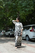Step out in effortless style with this black and white printed co-ord set for women. Crafted from soft, comfortable fabric, it offers a relaxed yet polished fit for all-day wear. The classic monochrome print adds a chic, modern touch, making it perfect for casual outings, office days, or stylish everyday looks. Pair with heels or sneakers for a versatile, fashion-forward ensemble.