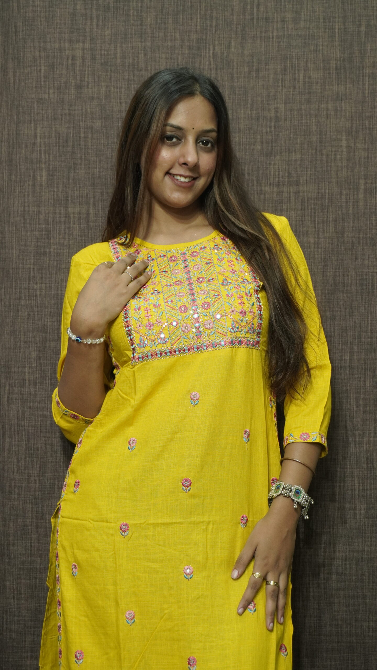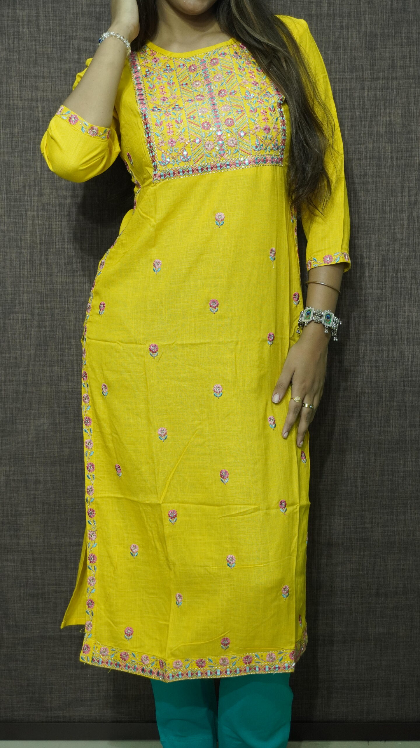 Shine bright in this mirror work embroidered kurta, designed to add elegance and sparkle to your ethnic wardrobe. Crafted from soft, comfortable fabric, it features intricate mirror detailing that catches the light beautifully. Perfect for festive occasions, family gatherings, or stylish traditional wear.