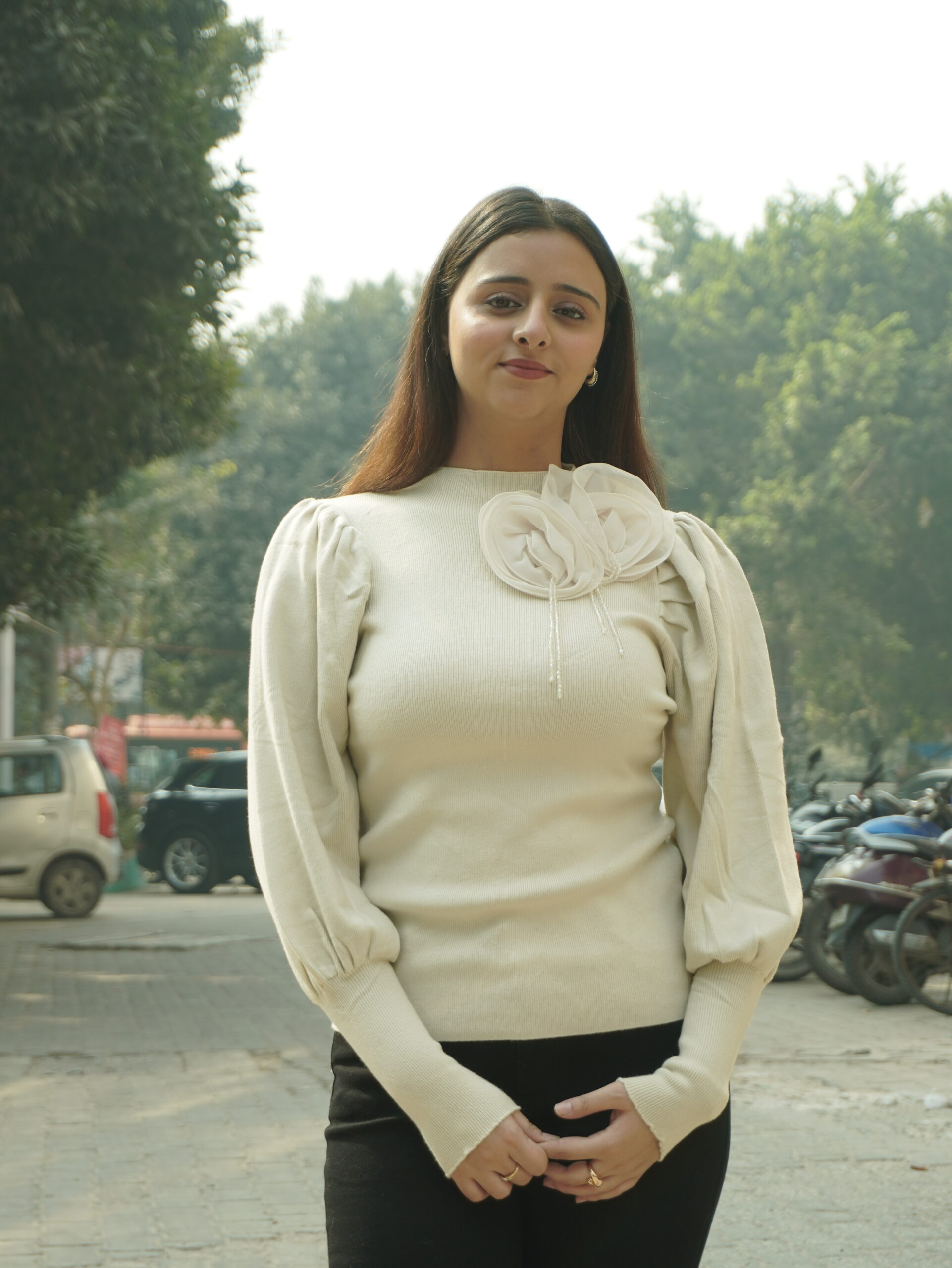 Elegant puff sleeved knit sweater with 3D floral accent in cream color.