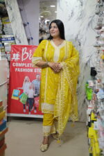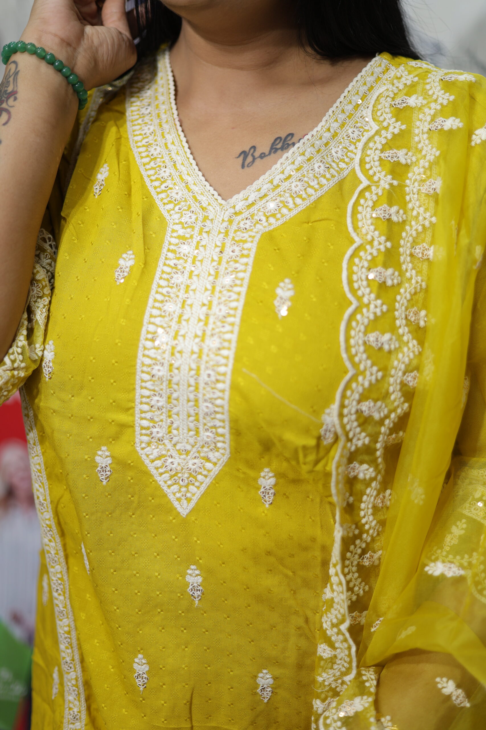 Brighten your ethnic wardrobe with this yellow suit set with dupatta. Made from soft, comfortable fabric, it features a vibrant hue and a matching dupatta for a complete, elegant look. Perfect for festive occasions, casual outings, or stylish day-to-day ethnic wear.